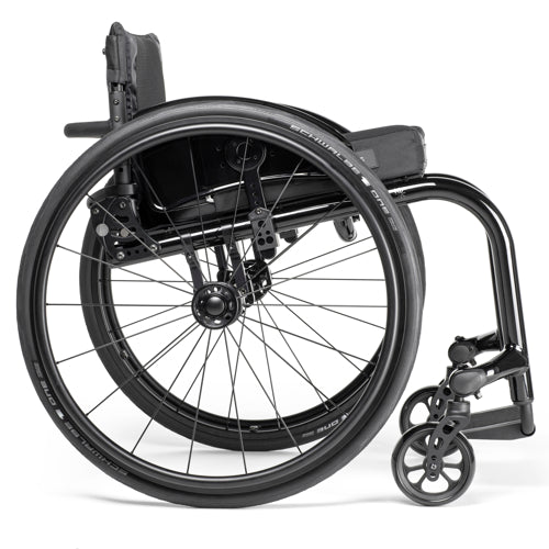Customisation extends beyond seating. Wheels, handrims, brakes and sideguards can all be specified to suit preference and use. A notable inclusion is Ki’s Maxx Performance Spokes, supplied as standard. These all-black wheels offer a look and feel comparable to premium lightweight wheels without the usual cost uplift. User-activated anti-tips can be flipped out of the way when not needed or folded discreetly for transport.