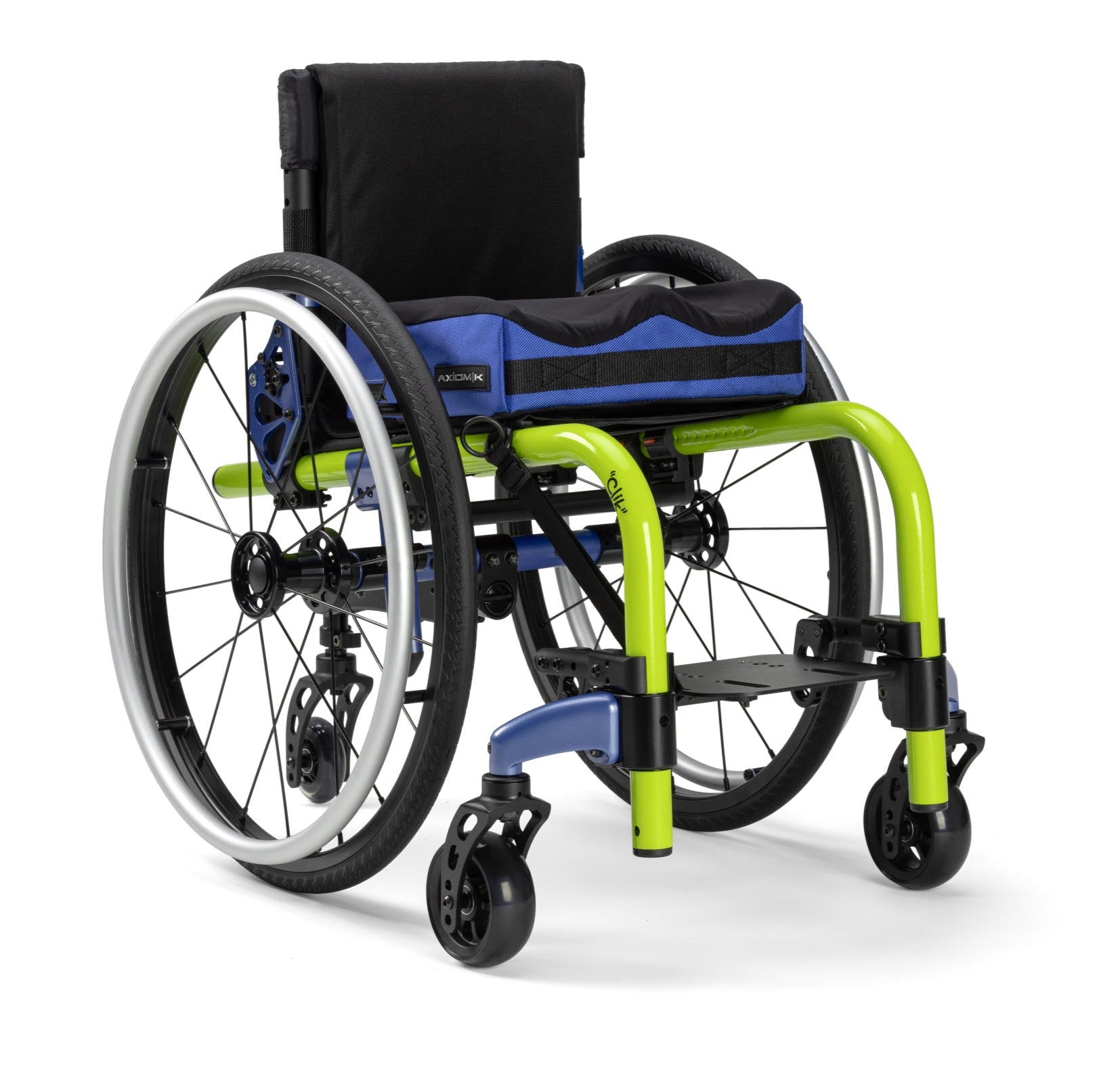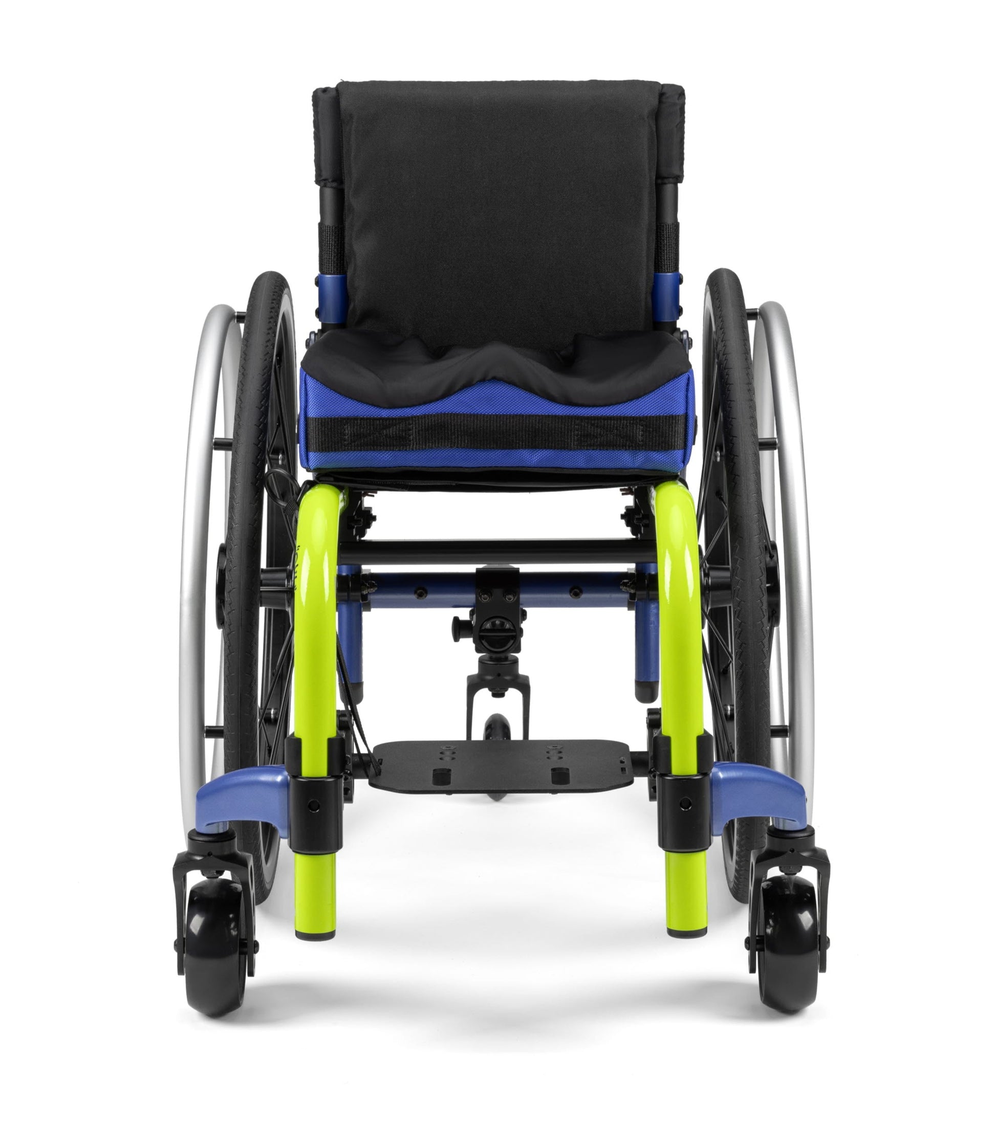 Configuration options are extensive. Armrests, footrests, wheels, tyres and handrims can all be specified to suit the child’s needs and abilities. Padded swing-away tubular armrests are a popular choice, with independent angle adjustment and integration into the backrest so they grow with the chair. X-Core mag wheels offer increased stiffness compared to standard mag wheels, with very low maintenance and minimal weight penalty. For children who require more space at the front — for example due to abducted positioning, AFOs or braces — the optional compound offset frame provides additional clearance. Third-party seating and cushions can also be fitted where more specialised support is required.