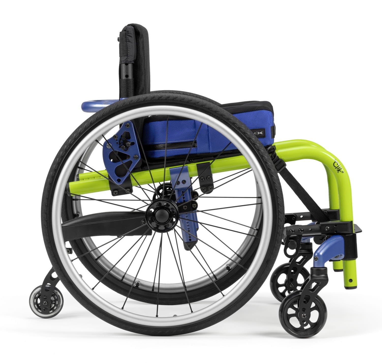 Despite being a rigid chair, the Clik is straightforward to transport. Quick-release rear wheels remove easily, and the backrest folds and locks down, with the back bar forming a convenient lifting point. Made from high-grade aluminium, transport weight starts from around 5.7 kg, allowing the chair to be lifted into a car without difficulty. It is fully crash-tested and can be supplied with transit brackets for occupied transport in adapted vehicles.